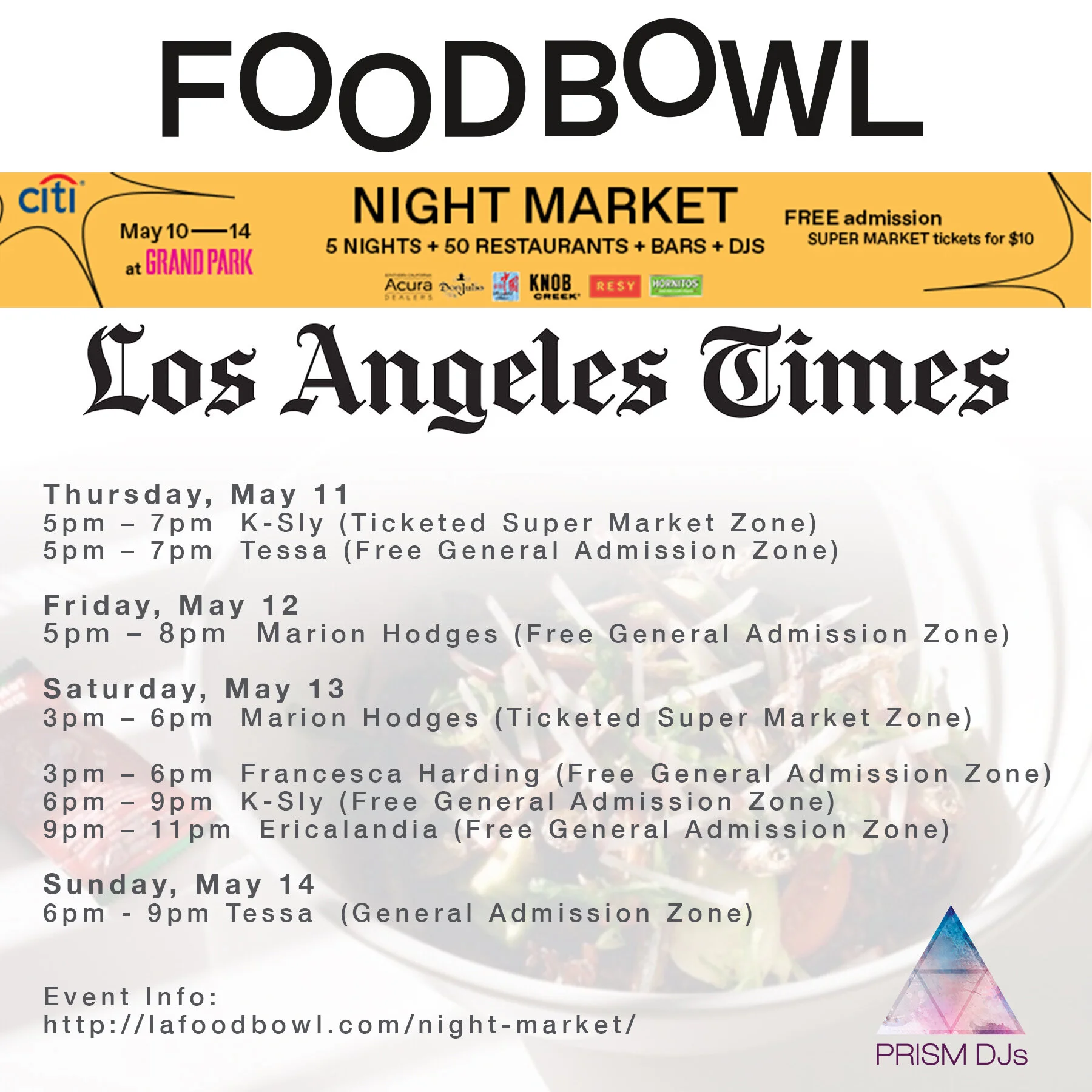 Blog Posts EVENTS Tessa Young 9/17/18 EVENTS Tessa Young 9/17/18 Prism DJs at Professional Hair and Makeup Expo Read More EVENTS Tessa Young 5/22/17 EVENTS Tessa Young 5/22/17 Disco New Wave Date Night with DJ Marion Hodges (KCRW) Read More EVENTS Tessa Young 5/8/17 EVENTS Tessa Young 5/8/17 LA Times Food Bowl Read More